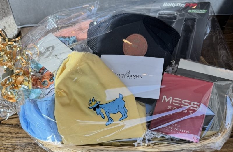 $350 Rothman’s GC, $100 Mur-Lee’s Men’s Shop GC, $45 Gold Coast Barber GC, BabyBliss Shaver, Cologne, $10 Tim Horton’s GC, Assorted goat attire