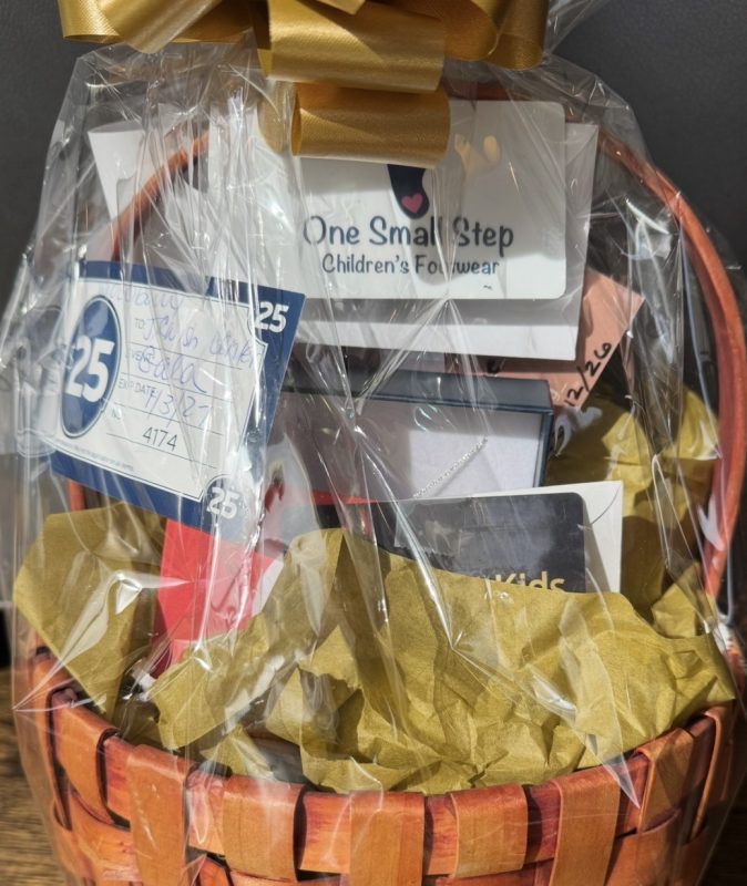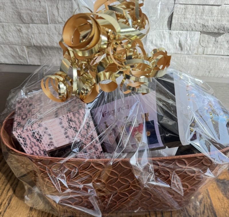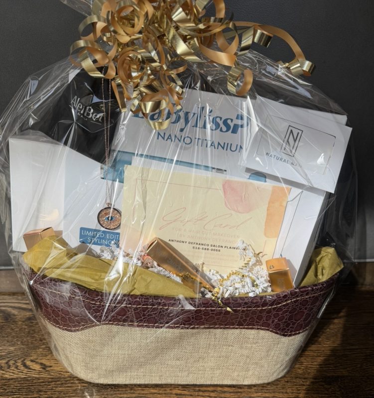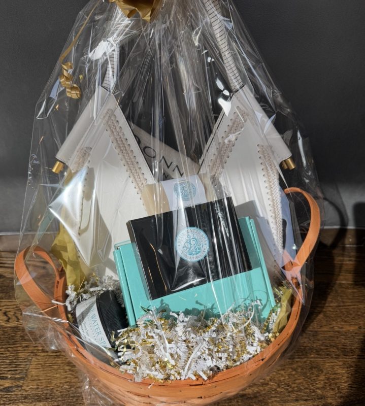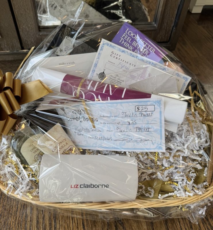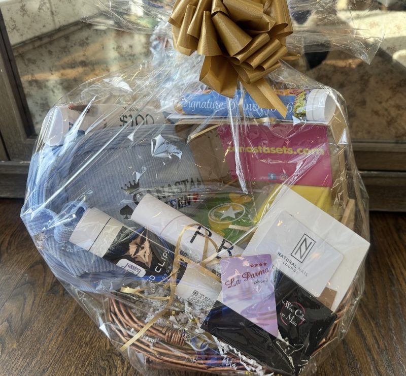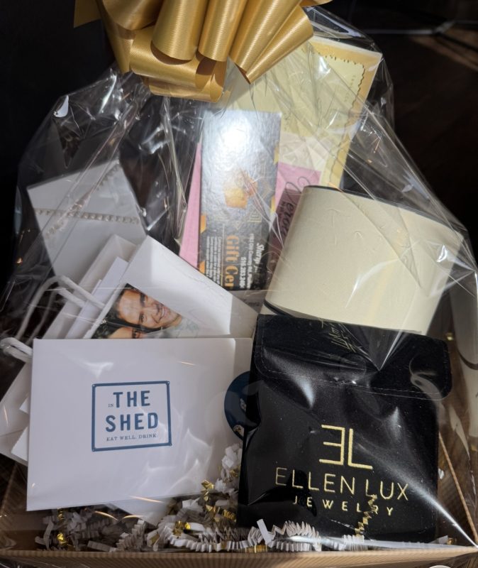 $250 Chico’s GCs, black shimmery sweater & jewelry, Liz Claiborne sunglasses, Manicure, Pedicure & Blowout from Erika Cole Salon, Hydrate Glow Facial from Lash Box, 4x $10 Cindi’s Boutique GCs, $50 Steve’s Piccola Bussola GC, $50 BiancoLatte GC, $25 Tavlin GC, $25 Family Bagel GC