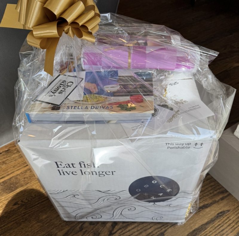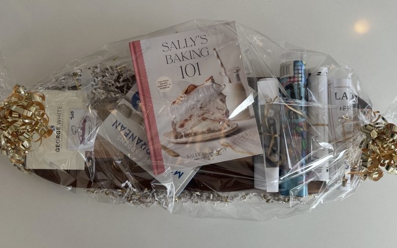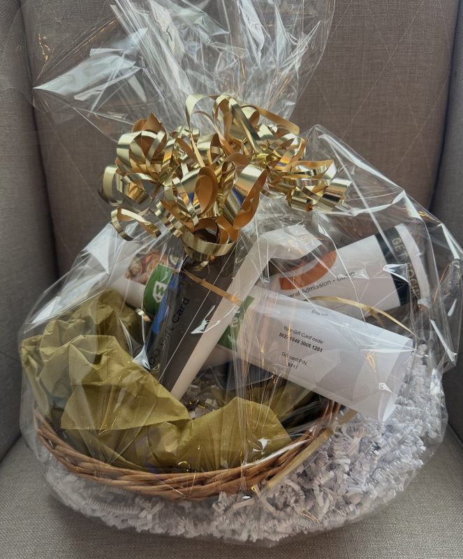 Breakfast Box for 6, $100 La Parma GC, $100 The Wine Cellar GC, $100 Wonder GC, $250 off party planning with Parties by Roni, $100 of a gorgeous montage from Cherished Clips, $25 Natural Nails GC, Canasta set & bag