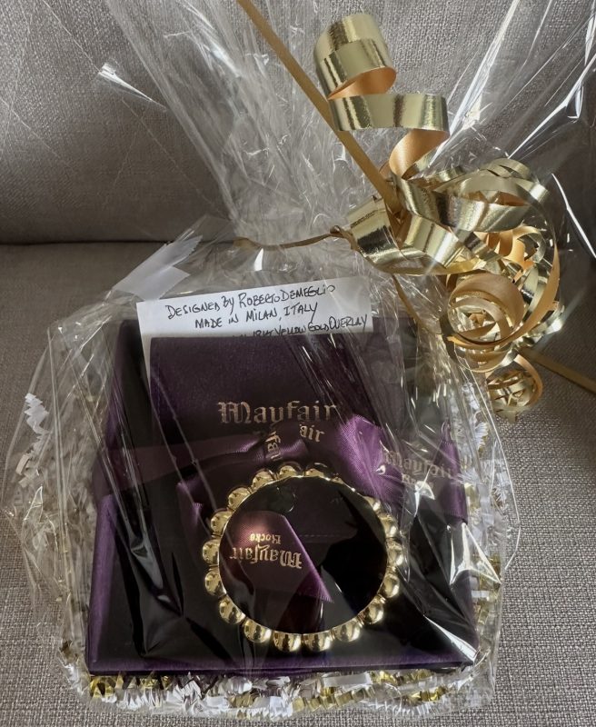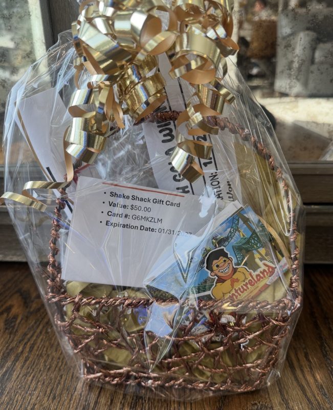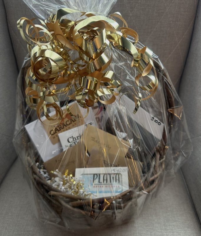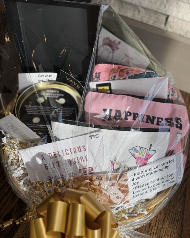 Mahjong with Joy Lesson for 4, Frida Rothman necklace Mahjong bags, $50 Granola Bar gift card, $50 Iavarone Bros GC, $50 Christina’s Epicure GC, Jessica Licthenstein candle, $25 Town Bagel GC, $25 Veroli Nail Spa GC