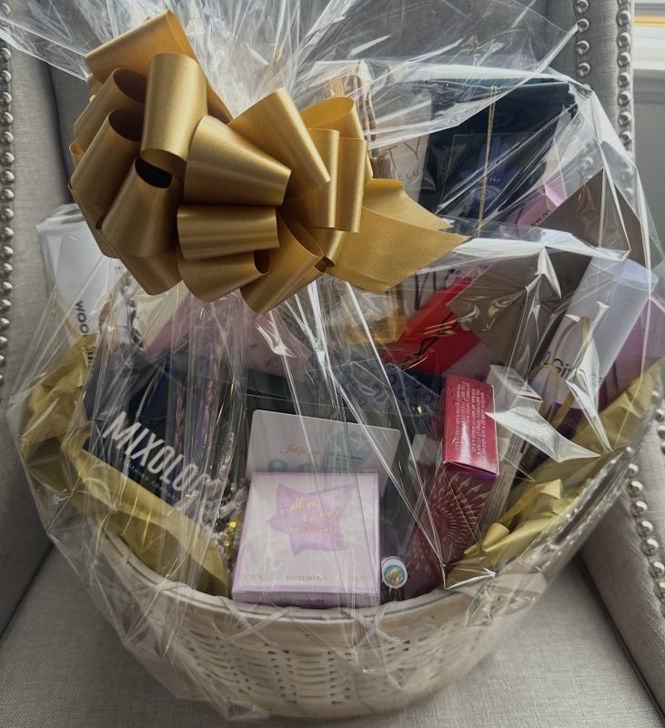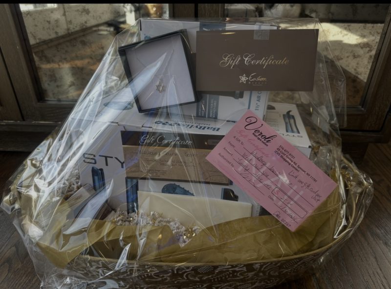 $100 Mixology GC, $50 Chick-fil-A Huntington GC, Rodan & Fields Hair Straightener, $50 BiancoLatte GC, $25 Just Salad GC, $50 Veroli Nail Spa GC, $20 Fly Me to the Moon GC, $30 Dot Cakes GC, $25 Dough & Co. GC, $25 Family Bagel GC, 1 necklace from Alef Bet jewelers, assorted makeup and fragrances